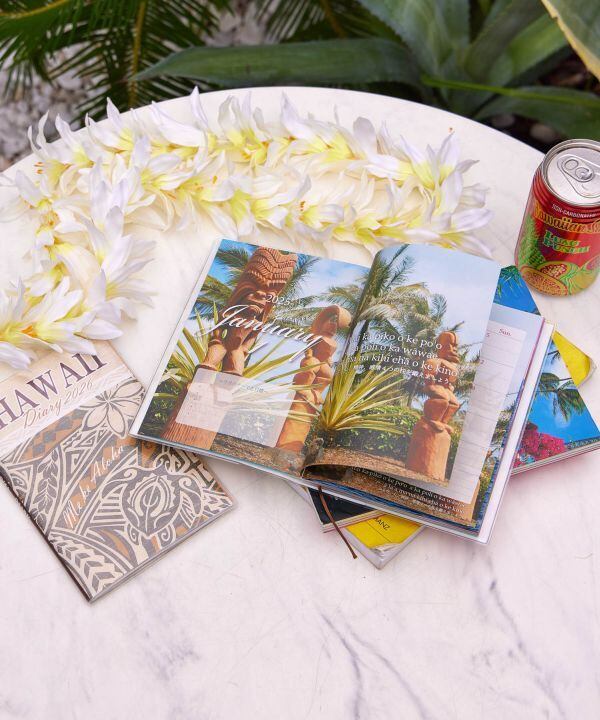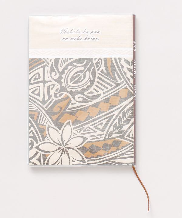 クラシックで上品なポリネシアントライバルの中をホヌ(ウミガメ)が泳いでいるような柄の手帳。ティアレのお花がやさしさをプラスしてくれます。大切なオハナへのプレゼントにも最適です。