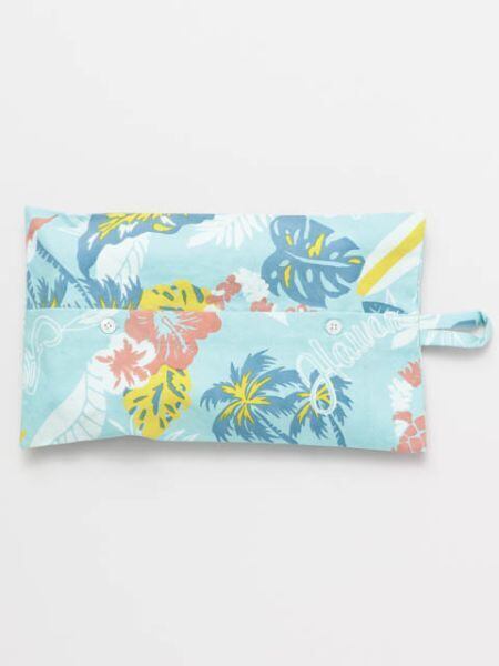 爽やかなカラートーンで全体的にハワイの象徴的なモチーフが散りばめられたティッシュカバー。ストラップの付け位置で縦横2通りの使い道があります。